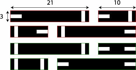 In this case, I created 8 simple images: 4 short (3x10) images and 4 long (3x21) ones. Each of which consists of black pixels except at both extremities, where I would randomly place either a vertical, or a horizontal white bar.